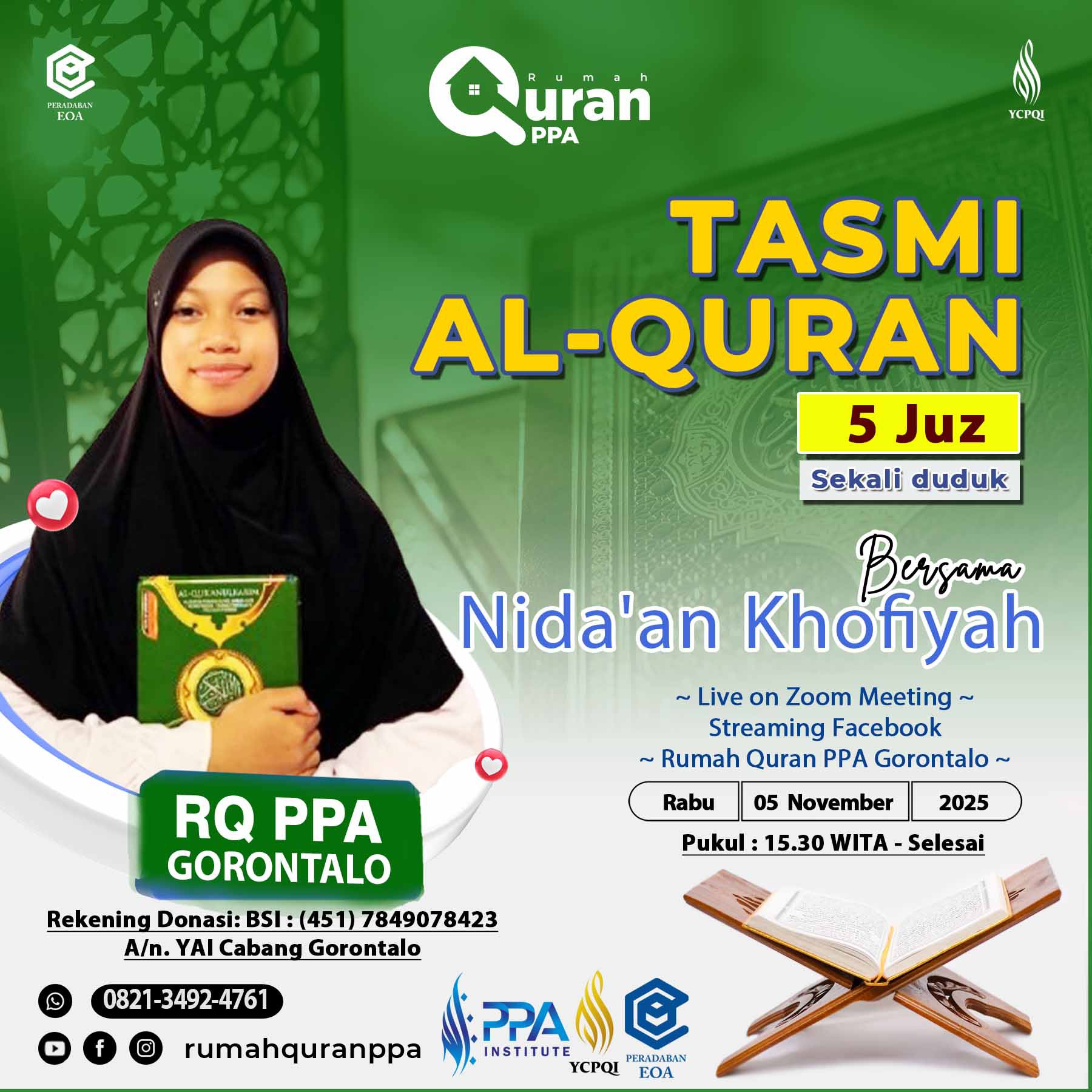 Insya Allah akan dilaksanakan tasmi’ Al-Quran 5 Juz oleh Ananda Nida’an Khofiyah (Santri Rumah Qur’an PPA Gorontalo) pada:
