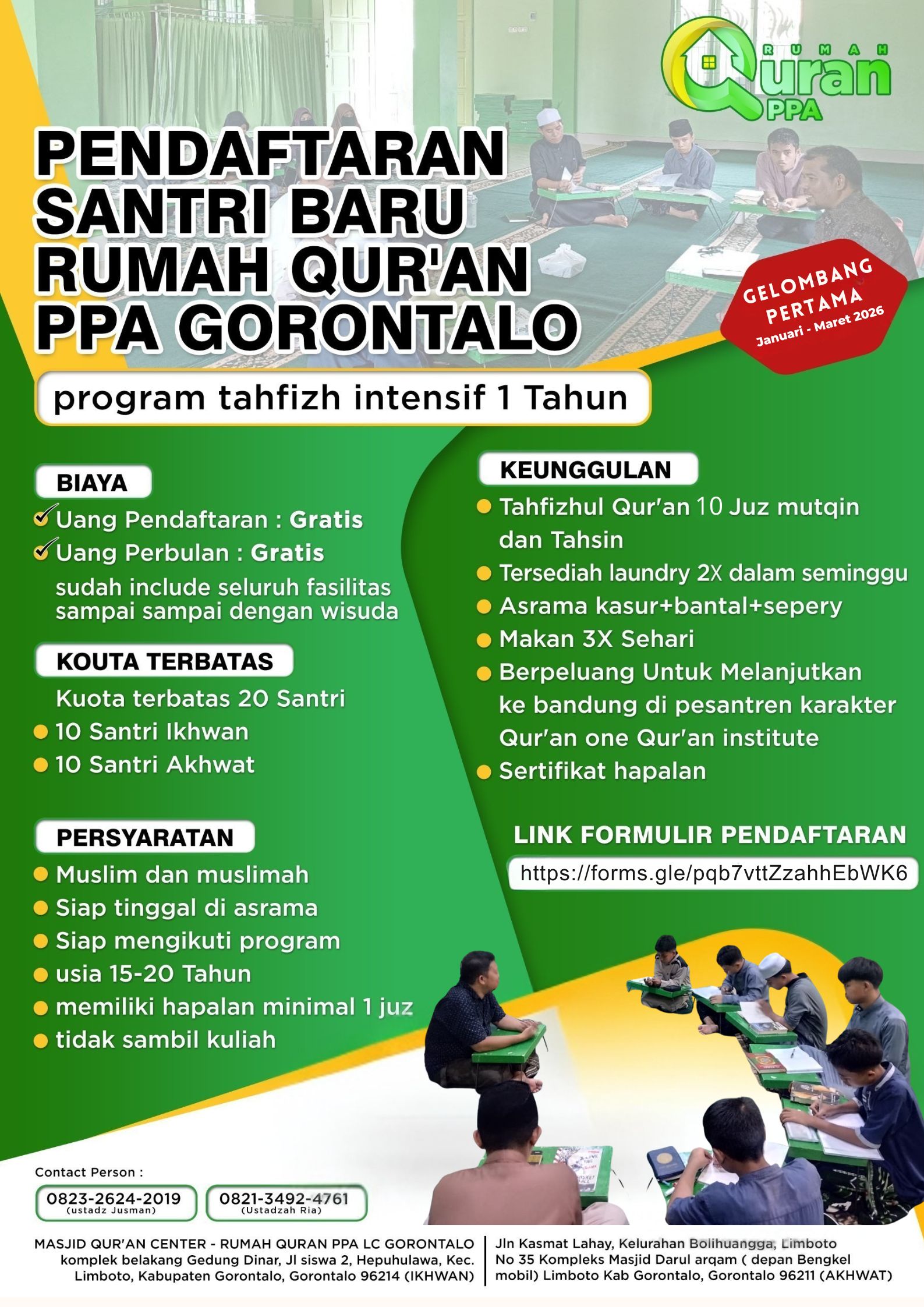 PENDAFTARAN SANTRI BARU RUMAH QUR’AN PPA GORONTALO TH 2026